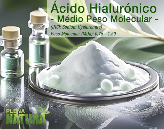 Ácido Hialurónico de Médio Peso Molecular- Activo Cosmético –(INCI: Sodium Hyaluronate) Peso Molecular (MDa): 0,75 – 1,50 (Médio Peso Molecular) CAS: 9067-32-7Tipo de produto: Activo cosmético em pó (Matéria prima de uso cosmético) Aspecto: Pó cristalino, branco ou quase branco.Solubilidade em água: SolúvelSolubilidade em óleo: InsolúvelO ácido hialurónico de médio peso molecular forma uma leve película na superfície da pele, fortalece a barreira hidrolipídica, proporciona hidratação duradoura da camada externa da epiderme.Embora penetre menos profundamente na pele, este tipo de Ácido Hialurónico possui propriedades hidratantes excepcionais e efeito suavizante de rugas. Forma uma fina camada não oclusiva na pele que evita a desidratação.Um excelente ingrediente cosmético anti-envelhecimento:O ácido hialurónico é um agente anti-envelhecimento efectivo que pode atrair até 1000 vezes seu próprio peso em água, o que estimula e dá volume à pele, dando-lhe um aspecto mais jovem. É usado com frequência em produtos hidratantes, pois a sua função não é apenas fornecer água à pele, mas mantê-la lá!Sendo uma molécula grande, não penetra profundamente na pele, mas permanece perto da superfície onde hidrata as camadas superficiais. As suas propriedades rejuvenescedoras resultam numa maior suavidade da pele, o que o torna muito eficaz contra rugas. Embora o ácido hialurónico por si só não estimule diretamente a produção de colagénio, ele pode indirectamente ajudar a melhorar a saúde da pele, o que pode resultar numa produção de colagénio mais eficaz!O ácido hialurónico é amplamente reconhecido pelos seus benefícios quando usado em produtos para a pele graças às suas propriedades únicas. Aqui ficam algumas das vantagens da sua inclusão em produtos para a pele:- Hidratação intensa: O ácido hialurónico é um humectante poderoso, capaz de atrair e reter até 1000 vezes o seu peso em água. Isto significa que ele pode fornecer uma hidratação intensa à pele, ajudando a mantê-la suave, macia e flexível.- Preenchimento de rugas e linhas finas: Graças à sua capacidade de reter água, o ácido hialurónico pode temporariamente preencher as rugas e linhas finas, proporcionando uma aparência mais suave e jovem à pele.- Melhoria da elasticidade da pele: Ao manter a pele hidratada e preenchida, o ácido hialurónico pode melhorar a elasticidade da pele, ajudando-a a parecer mais firme e tonificada.- Estimulação da cicatrização da pele: O ácido hialurónico pode ajudar a acelerar o processo de cicatrização da pele, tornando-o útil em produtos para o tratamento de feridas, queimaduras solares e outros danos cutâneos menores.- Compatibilidade com todos os tipos de pele: O ácido hialurónico é naturalmente encontrado na pele humana, o que o torna compatível com todos os tipos de pele, incluindo peles sensíveis. Ele é geralmente bem tolerado e raramente causa irritação.- Acção antioxidante: Alguns estudos sugerem que o ácido hialurónico pode ter propriedades antioxidantes, ajudando a proteger a pele dos danos causados pelos radicais livres e pelo envelhecimento precoce.- Redução da vermelhidão e irritação: O ácido hialurónico tem propriedades calmantes e anti-inflamatórias que podem ajudar a reduzir a vermelhidão e a irritação da pele, tornando-o útil para pessoas com pele sensível ou propensa a irritações.- Melhoria da aparência da pele opaca e sem brilho: Ao hidratar profundamente a pele e melhorar sua textura, o ácido hialurónico pode ajudar a restaurar o brilho e a luminosidade da pele, deixando-a com uma aparência mais saudável e radiante.- Compatibilidade com outros ingredientes: O ácido hialurónico é frequentemente combinado com outros ingredientes ativos em produtos para a pele, como antioxidantes, vitaminas e peptídeos. Essas combinações podem potencializar os benefícios para a pele e proporcionar resultados mais abrangentes.- Acção anti-envelhecimento: Além de preencher rugas e linhas finas, o ácido hialurónico pode ajudar a retardar o processo de envelhecimento da pele, protegendo-a contra danos ambientais e estimulando a produção de colagénio e elastina, duas proteínas importantes para a firmeza e elasticidade da pele.- Textura leve e não oleosa: Os produtos contendo ácido hialurónico geralmente têm uma textura leve e não oleosa, o que os torna adequados para todos os tipos de pele, incluindo peles oleosas e propensas a acne.- …Os usos para o ácido hialurónico incluem (mas não estão limitados a)*:- Cuidados faciais- Loções- CremesUso*: 0,1 – 1% – O ácido hialurónico é um pó solúvel em água. Funciona melhor quando adicionado à fase aquosa ou na fase de arrefecimento. Não é conveniente aquecê-lo a mais de 70 ºC.Armazenamento e Precauções: Manter os recipientes bem fechados em local seco, fresco e bem ventilado. Proteja da luz. Proteja do calor. Armazenar em temperaturas: 2 – 8°CManusear de acordo com as boas práticas industriais de higiene e segurança. Fumar, comer e beber deve ser proibido na área de aplicação. Evite a formação de poeiras. Não respire as poeiras. Garanta ventilação adequada. Em caso de ventilação insuficiente, usar proteção respiratória. Evite contaminação dos olhos e da pele. Manter afastado do calor, faíscas, chamas e outras fontes de ignição. * Estas informações servem apenas como um guia e os resultados podem variar dependendo da especificidade das receitas. É da responsabilidade do utilizador efectuar testes antes de prosseguir com a sua utilização.Ficha de Dados de Segurança (MSDS) e Certificado de Análise (CoA) fornecidos a pedido
