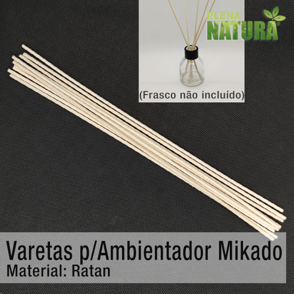 Varetas de Ratan para Ambientador Mikado – 30cm/3mmVaretas difusoras de alta qualidade com 30 cm de comprimento e 3 mm de diâmetro. Faça o seu próprio difusor de aromas com as Varetas de Ratan – uma forma simples, e decorativa, de difundir fragrâncias ou óleos essenciais no ambiente: Coloque as varetas num frasco previamente cheio com óleos essenciais ou fragrâncias da sua preferência, diluídos em Augeo® Clean Multi e coloque-o no espaço que pretende aromatizar – tão simples como isso!A superfície não tratada das Varetas de Ratan natural e a estrutura tubular das mesmas garantem que o líquido seja bem absorvido e o aroma se evapore da sua superfície para o ar. A intensidade do aroma pode ser facilmente controlada pelo número de varetas usado: a quantidade do líquido do frasco que se irá evaporar de cada vez, será apenas a que as varetas inseridas absorverem. Portanto, se quisermos sentir o aroma com um pouco mais de intensidade, basta colocar mais uma Vareta de Ratan natural no líquido. A força do perfume não depende só da quantidade de óleo essencial ou fragrância, mas também do número de varetas difusoras usadas.- Material: Ratan- Comprimento (aprox): 30 cm- Diâmetro (aprox): 3 mm(Foto apenas para fins ilustrativos. A aparência do produto pode variar.)